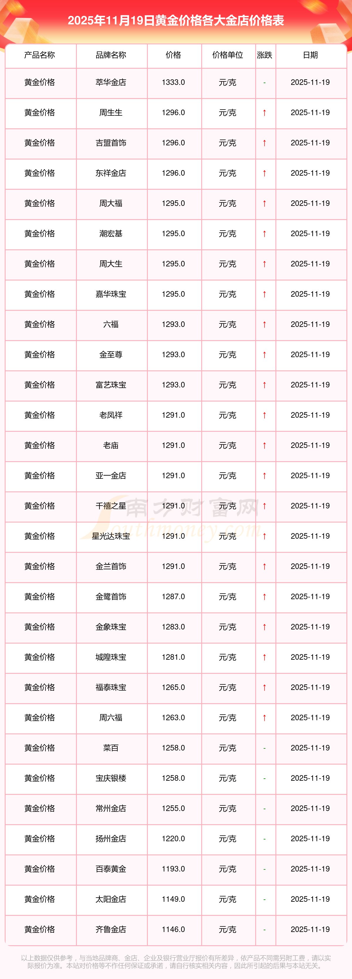 今天是2025年11月19日,周大福、周大福、周大福、周大福、周大福、周大福、周大福、老凤祥、老凤祥、老凤祥、周六福等各大金店品牌黄金价格最新价格如下:周大福1295.0元/克、周大福619.0元/克、周大福1295.0元/克、周大福45120.0、周大福17690.0、周大福40700.0、周大福1133.0元/克、老凤祥1291.0元/克、老凤祥600.0元/克、老凤祥1291.0元/克、周六福1263.0元/克。