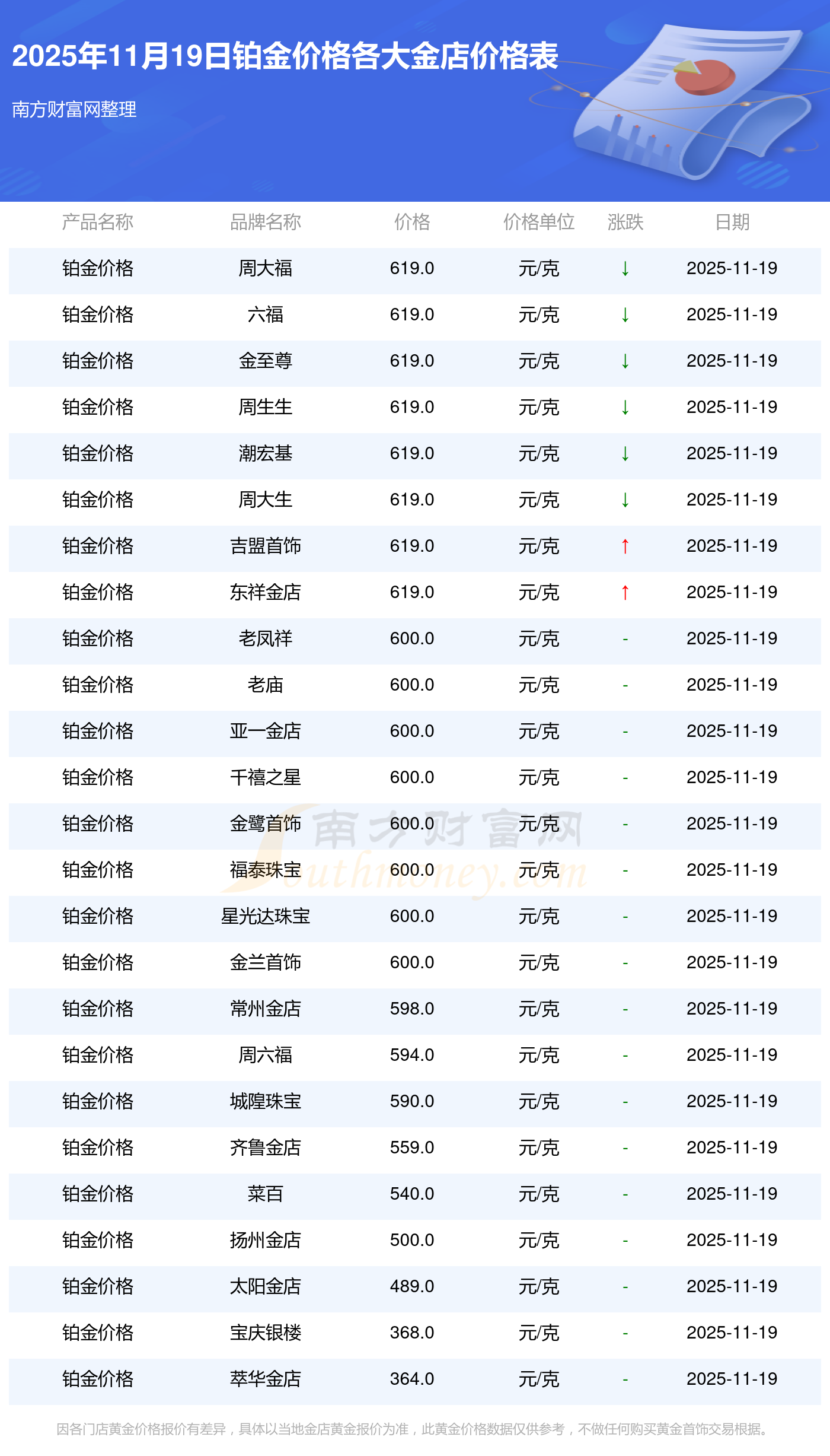 2025年11月19日周大福、周大福、周大福、周大福、周大福、周大福、周大福、老凤祥、老凤祥、老凤祥、周六福等各大金店品牌铂金价格最新价格如下:周大福黄金价格1295.0元/克,周大福铂金价格619.0元/克,周大福饰品金价(内地)1295.0元/克,周大福黄金饰品(香港)45120.0,周大福铂金价格(香港)17690.0,周大福金条价格(香港)40700.0,周大福金条金价(内地)1133.0元/克,老凤祥黄金价格1291.0元/克,老凤祥铂金价格600.0元/克,老凤祥足金价格1291.0元/克,周六福黄金价格1263.0元/克。