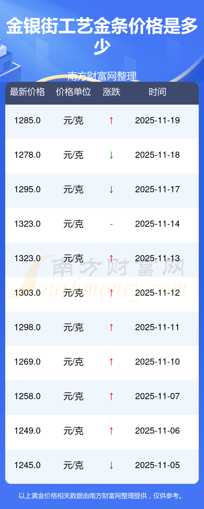 今日(2025年11月19日),金银街工艺金条最新价格为1285.0元/克。