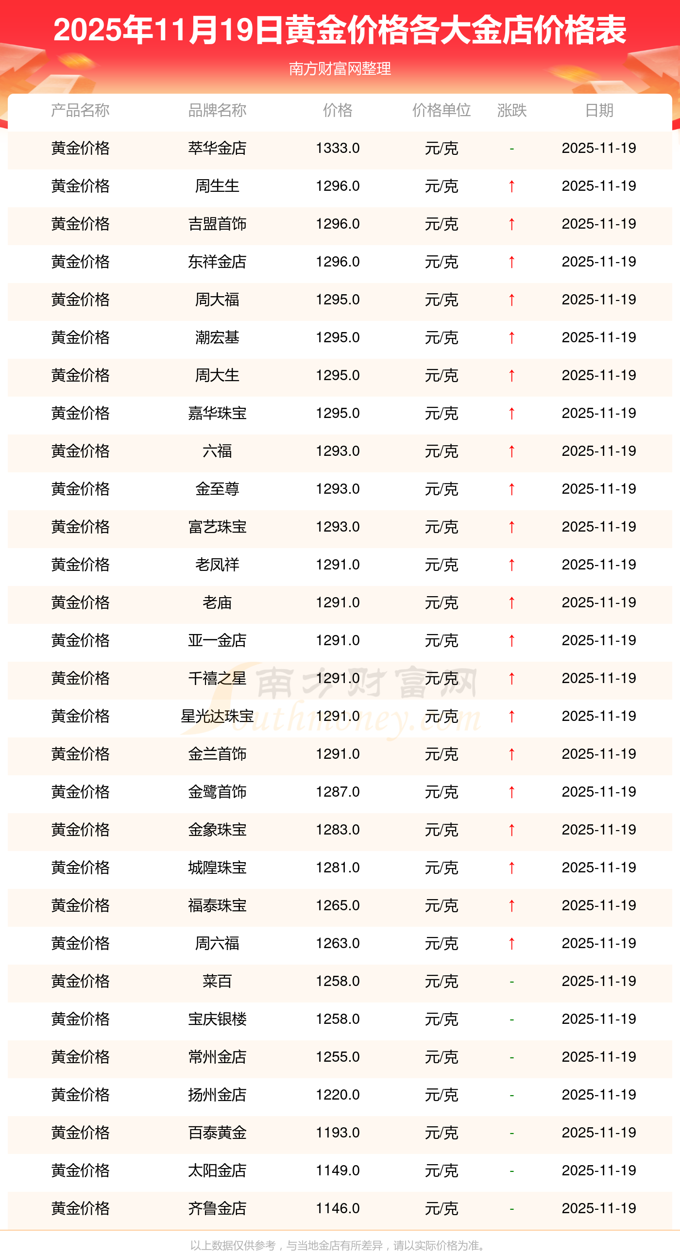 2025年11月19日周大福、周大福、周大福、周大福、周大福、周大福、周大福、老凤祥、老凤祥、老凤祥、周六福等各大金店品牌黄金价格最新价格如下:周大福黄金价格1295.0元/克,周大福铂金价格619.0元/克,周大福饰品金价(内地)1295.0元/克,周大福黄金饰品(香港)45120.0,周大福铂金价格(香港)17690.0,周大福金条价格(香港)40700.0,周大福金条金价(内地)1133.0元/克,老凤祥黄金价格1291.0元/克,老凤祥铂金价格600.0元/克,老凤祥足金价格1291.0元/克,周六福黄金价格1263.0元/克。