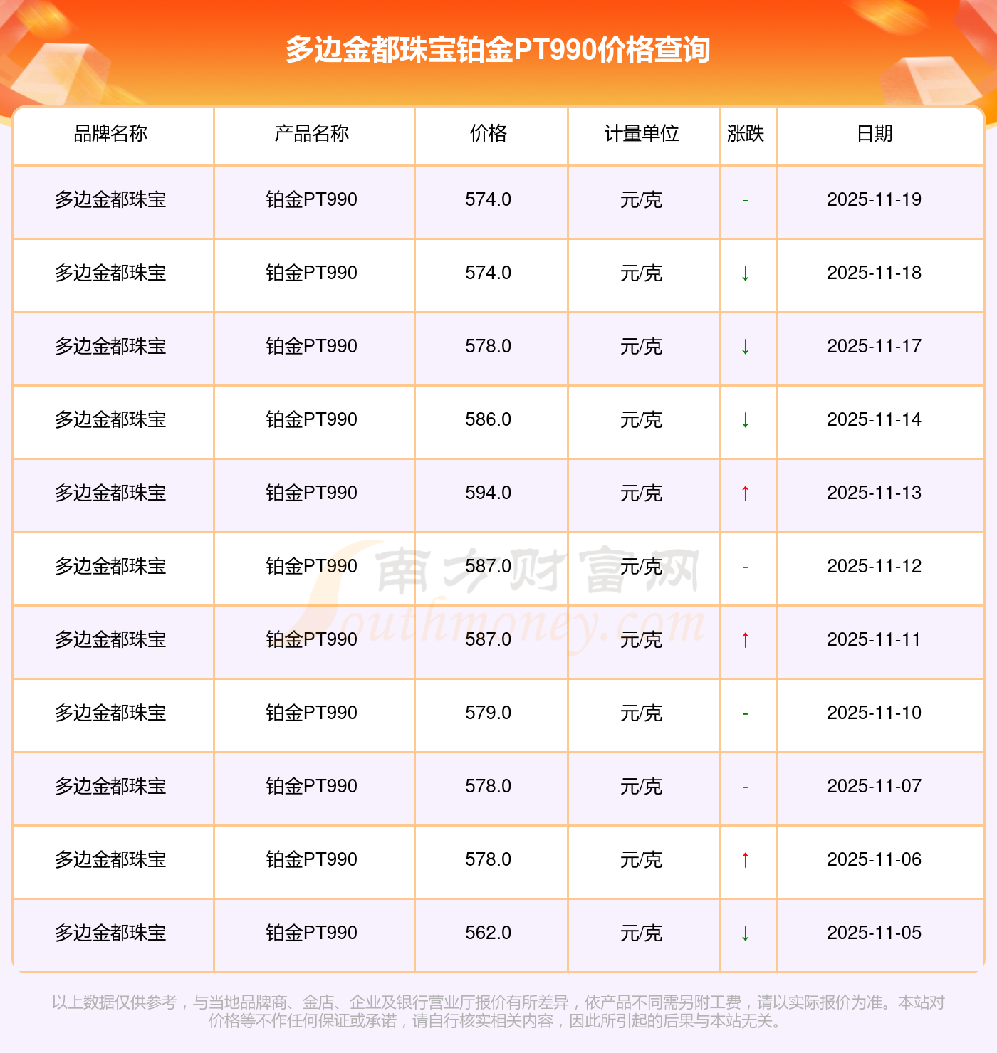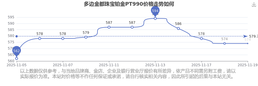 今日多边金都珠宝所公布的 铂金PT990最新价格为574.0元/克。