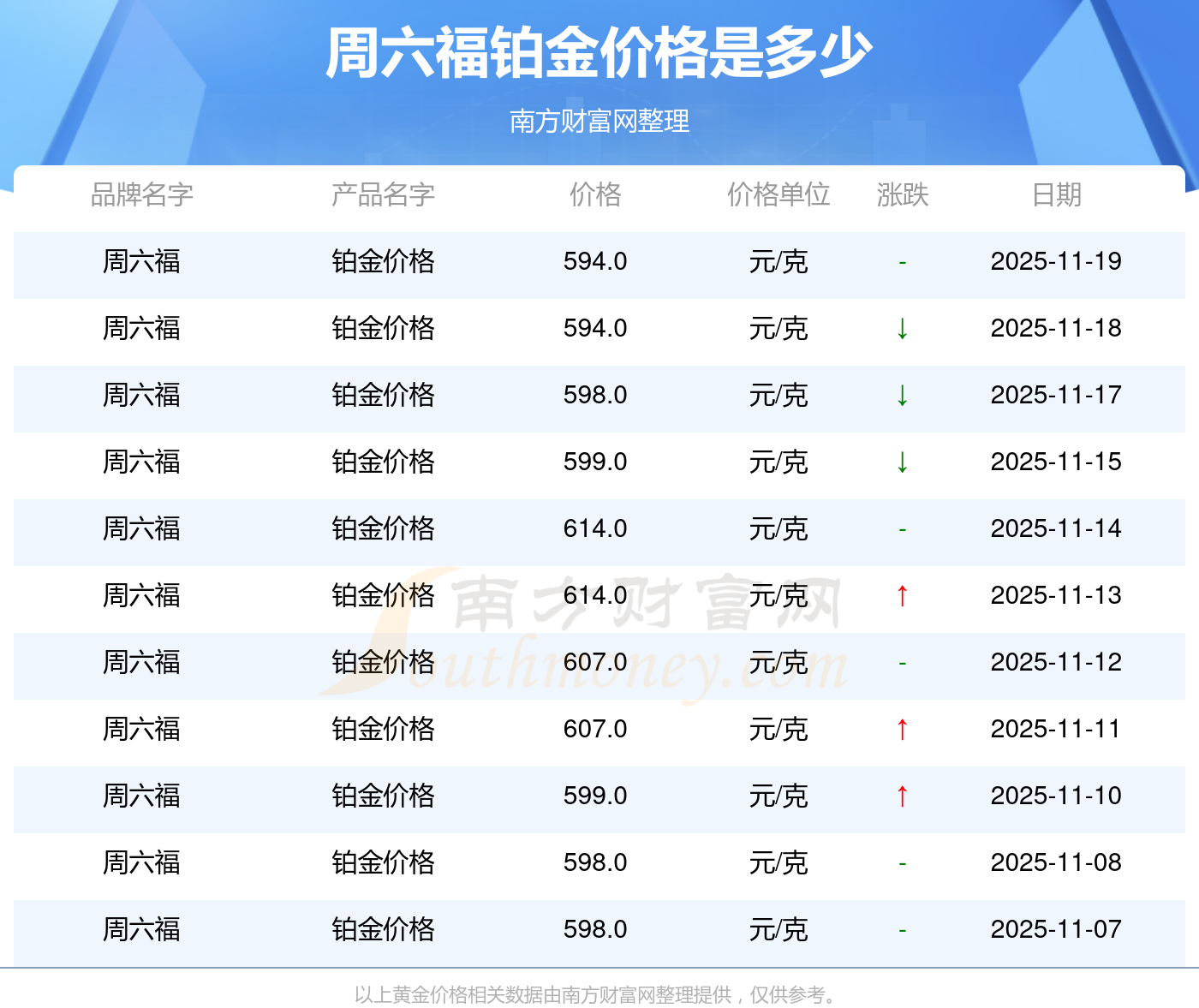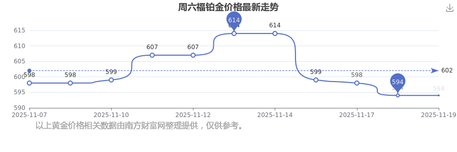 今日(2025年11月19日)周六福铂金价格是594.0元/克。