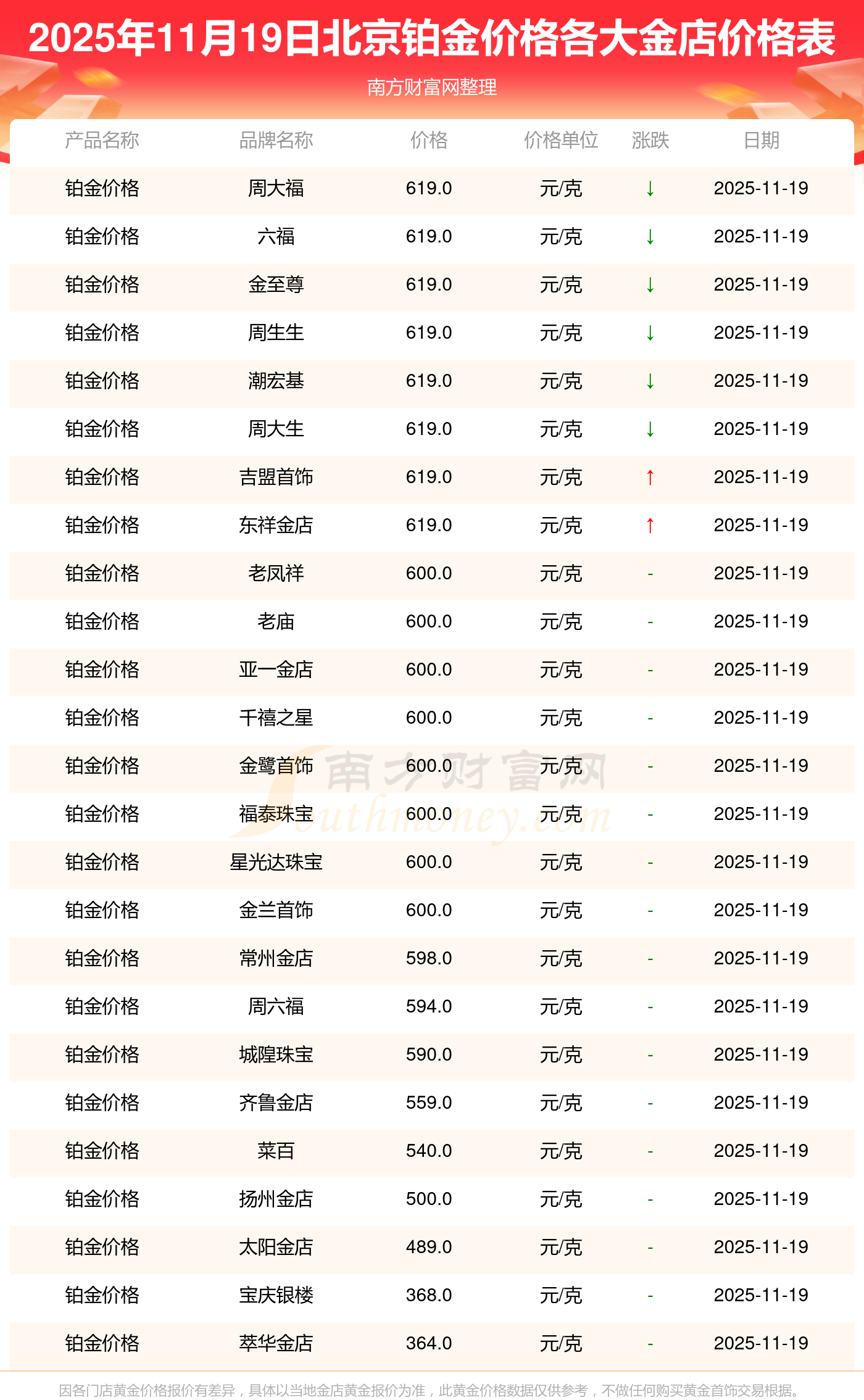 今天是2025年11月19日,北京周大福、周大福、周大福、周大福、周大福、周大福、周大福、老凤祥、老凤祥、老凤祥、周六福等各大金店品牌铂金价格最新价格行情是这样的:周大福1295.0元/克、周大福619.0元/克、周大福1295.0元/克、周大福45120.0、周大福17690.0、周大福40700.0、周大福1133.0元/克、老凤祥1291.0元/克、老凤祥600.0元/克、老凤祥1291.0元/克、周六福1263.0元/克。