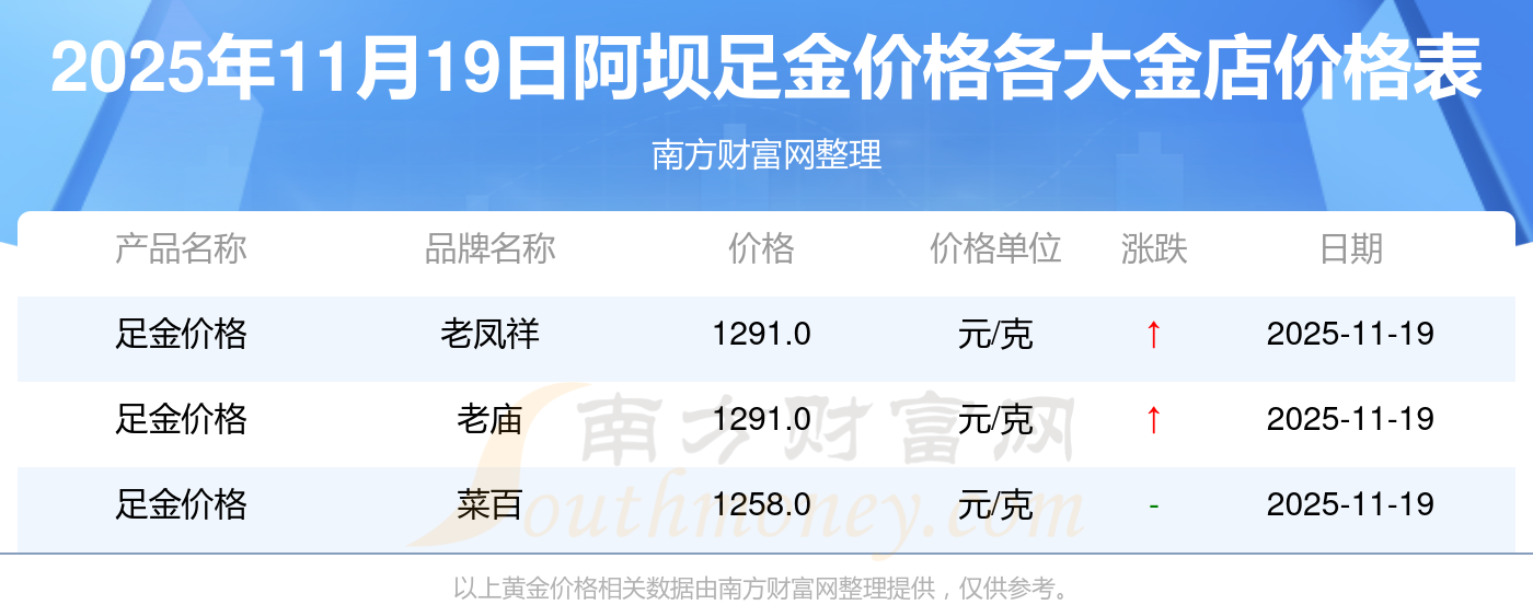 2025年11月19日阿坝各大金店足金价格最新价格:周大福1295.0元/克,周大福619.0元/克,周大福1295.0元/克,周大福45120.0,周大福17690.0,周大福40700.0,周大福1133.0元/克,老凤祥1291.0元/克,老凤祥600.0元/克,老凤祥1291.0元/克,周六福1263.0元/克。