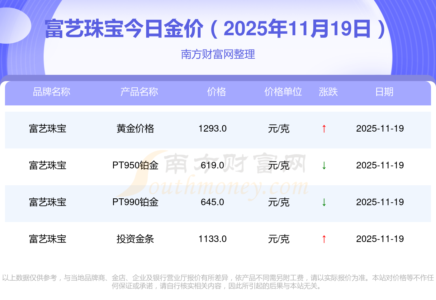 富艺珠宝金价今日价格:黄金价格1295.0元/克,铂金价格619.0元/克,饰品金价(内地)1295.0元/克,黄金饰品(香港)45120.0,铂金价格(香港)17690.0,金条价格(香港)40700.0,金条金价(内地)1133.0元/克,黄金价格1291.0元/克,铂金价格600.0元/克,足金价格1291.0元/克,黄金价格1263.0元/克。