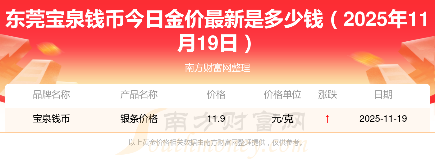2025年11月19日东莞宝泉钱币一克黄金对应的价格是多少?黄金价格1295.0元/克,铂金价格619.0元/克,饰品金价(内地)1295.0元/克,黄金饰品(香港)45120.0,铂金价格(香港)17690.0,金条价格(香港)40700.0,金条金价(内地)1133.0元/克,黄金价格1291.0元/克,铂金价格600.0元/克,足金价格1291.0元/克,黄金价格1263.0元/克。