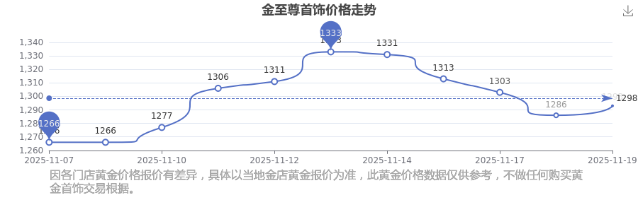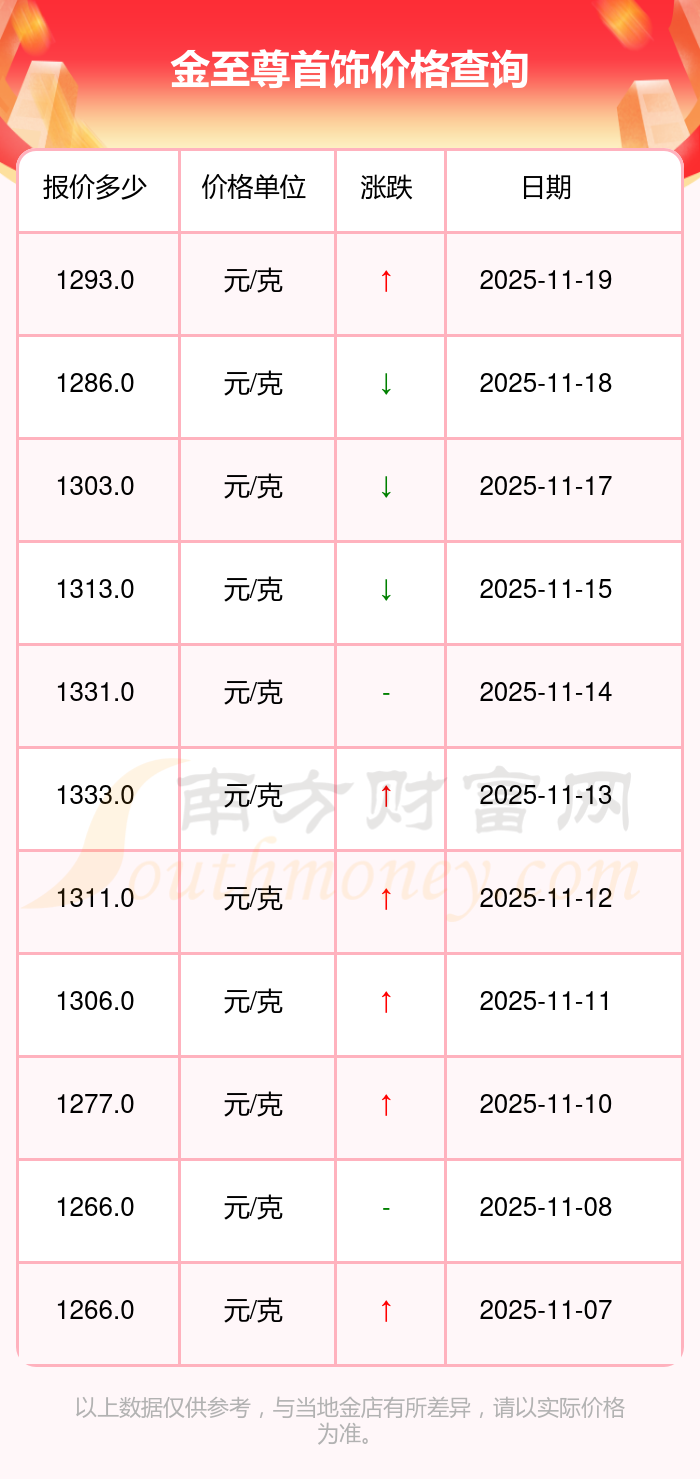 2025年11月19日金至尊首饰价格是1293.0元/克。