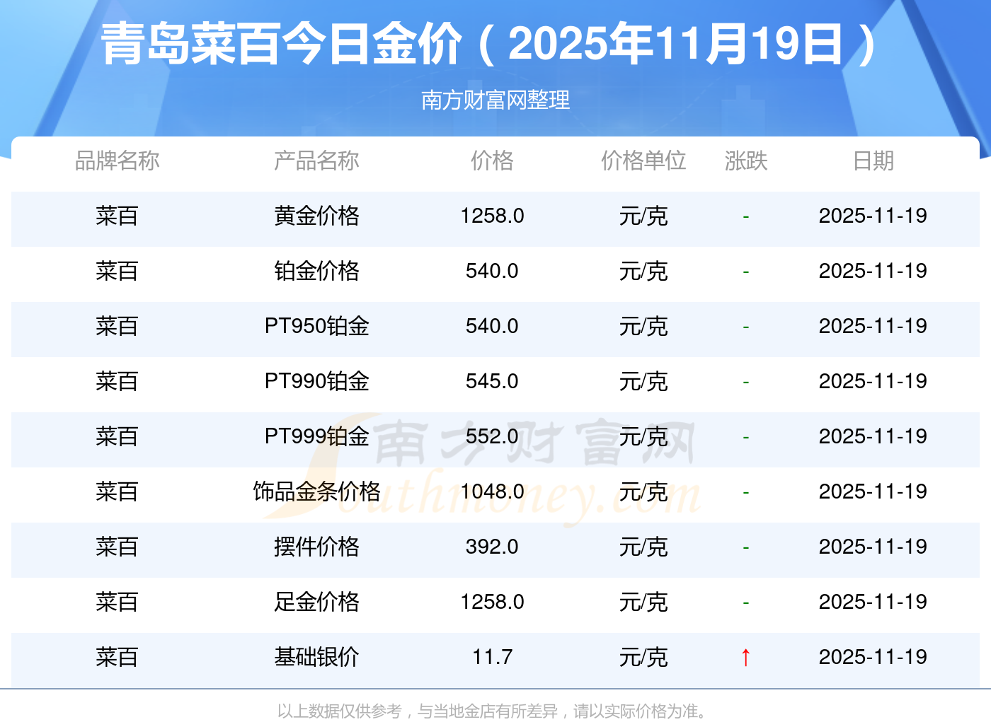 2025年11月19日青岛菜百现在黄金一克要多少钱:黄金价格1295.0元/克,铂金价格619.0元/克,饰品金价(内地)1295.0元/克,黄金饰品(香港)45120.0,铂金价格(香港)17690.0,金条价格(香港)40700.0,金条金价(内地)1133.0元/克,黄金价格1291.0元/克,铂金价格600.0元/克,足金价格1291.0元/克,黄金价格1263.0元/克。