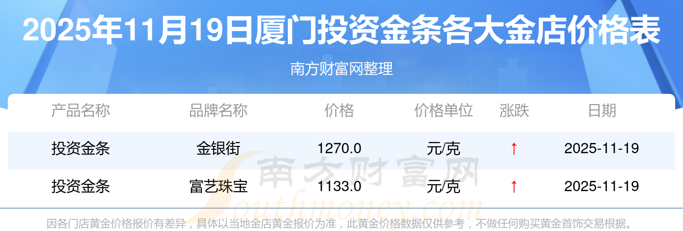 2025年11月19日厦门周大福、周大福、周大福、周大福、周大福、周大福、周大福、老凤祥、老凤祥、老凤祥、周六福等各大金店品牌投资金条最新价格如下:周大福黄金价格1295.0元/克,周大福铂金价格619.0元/克,周大福饰品金价(内地)1295.0元/克,周大福黄金饰品(香港)45120.0,周大福铂金价格(香港)17690.0,周大福金条价格(香港)40700.0,周大福金条金价(内地)1133.0元/克,老凤祥黄金价格1291.0元/克,老凤祥铂金价格600.0元/克,老凤祥足金价格1291.0元/克,周六福黄金价格1263.0元/克。