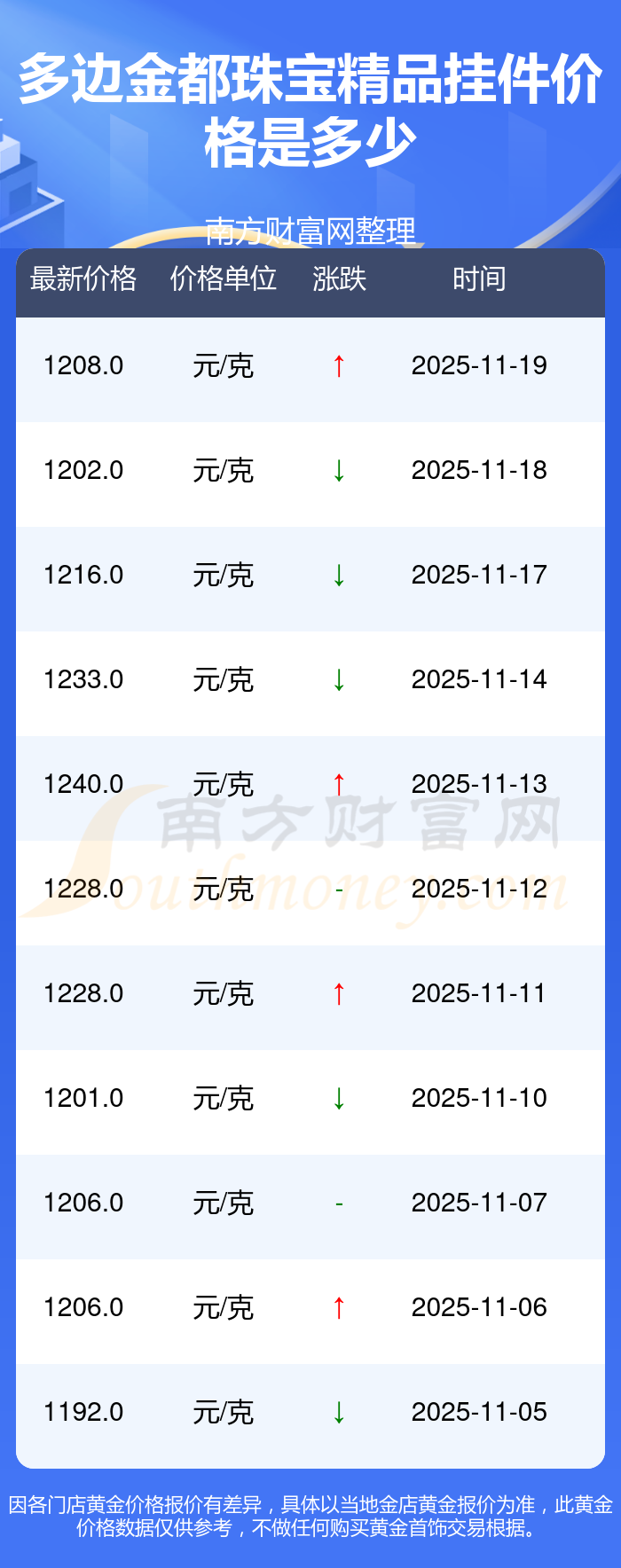 当下,多边金都珠宝 精品挂件今日的最新价格是1208.0元/克。