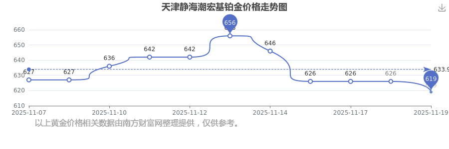 天津静海潮宏基铂金价格在 2025年11月19日,其市场价格为 619.0元/克。