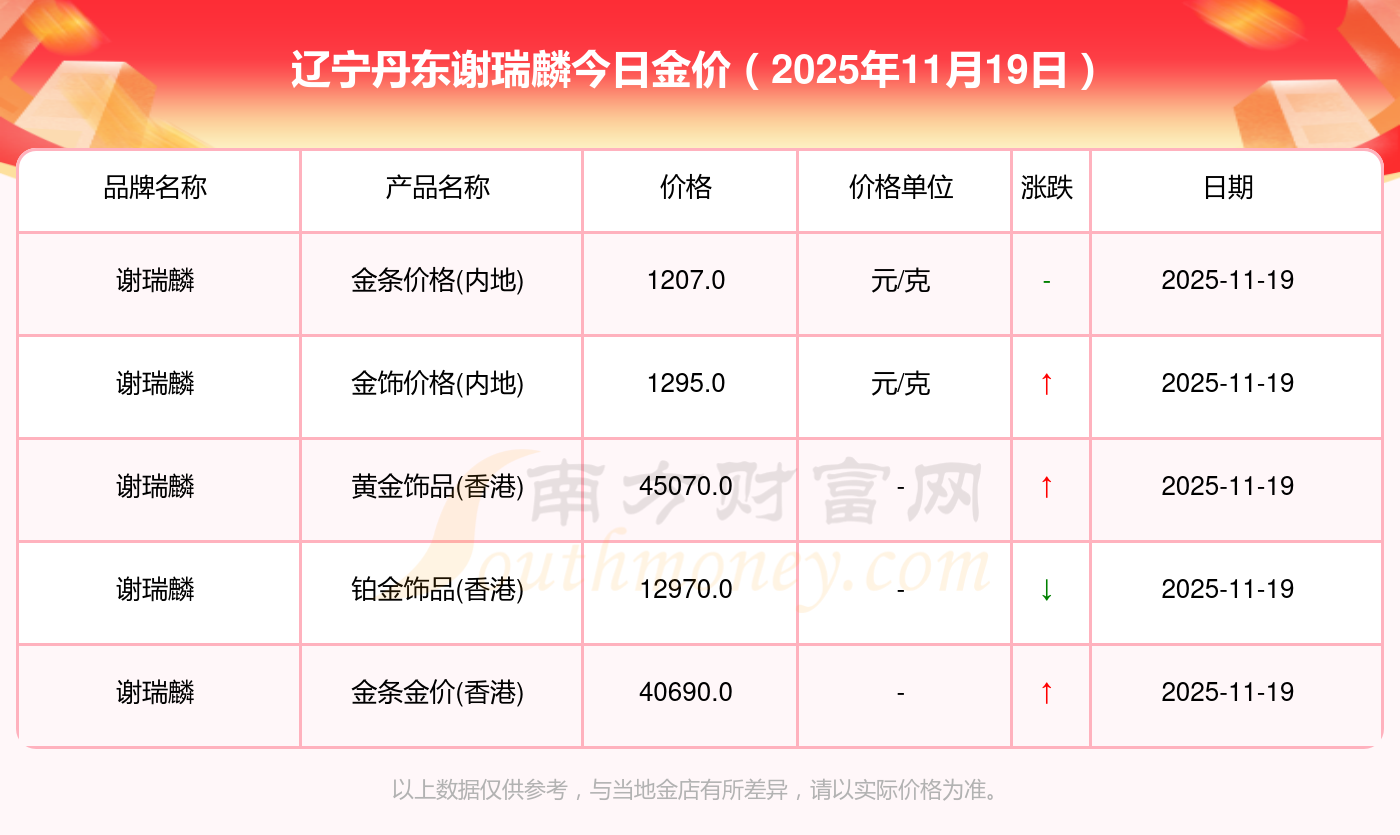 2025年11月19日辽宁丹东谢瑞麟一克黄金对应的价格是多少?黄金价格1295.0元/克,铂金价格619.0元/克,饰品金价(内地)1295.0元/克,黄金饰品(香港)45120.0,铂金价格(香港)17690.0,金条价格(香港)40700.0,金条金价(内地)1133.0元/克,黄金价格1291.0元/克,铂金价格600.0元/克,足金价格1291.0元/克,黄金价格1263.0元/克。