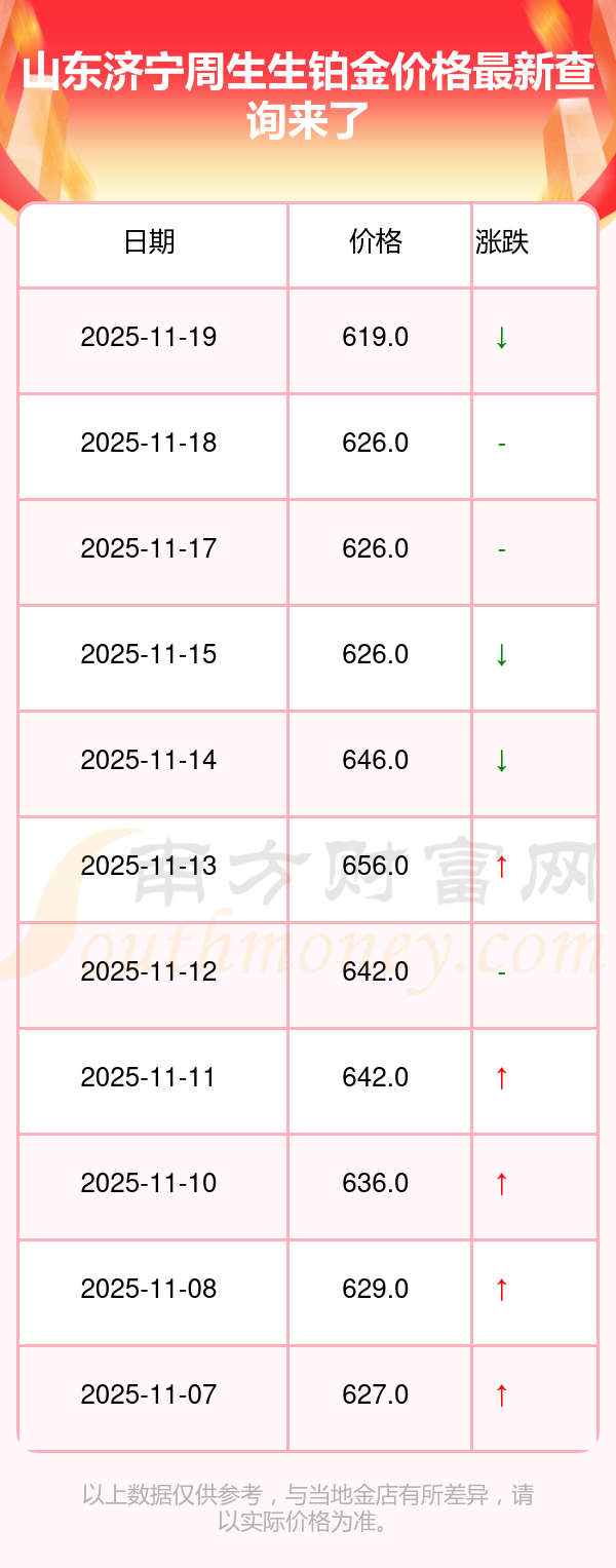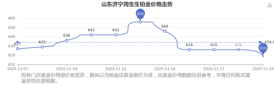 今日(2025年11月19日)山东济宁周生生铂金价格:619.0元/克。