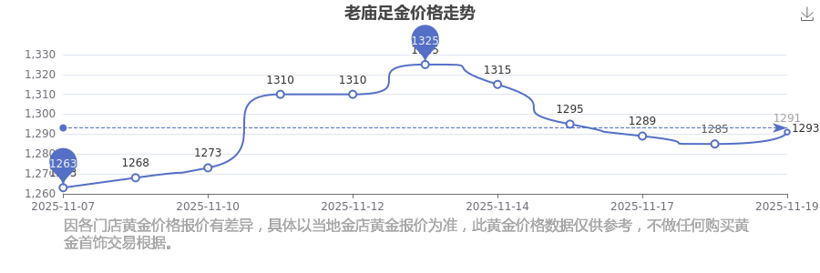老庙 足金价格于今日的最新挂牌价为1291.0元/克。