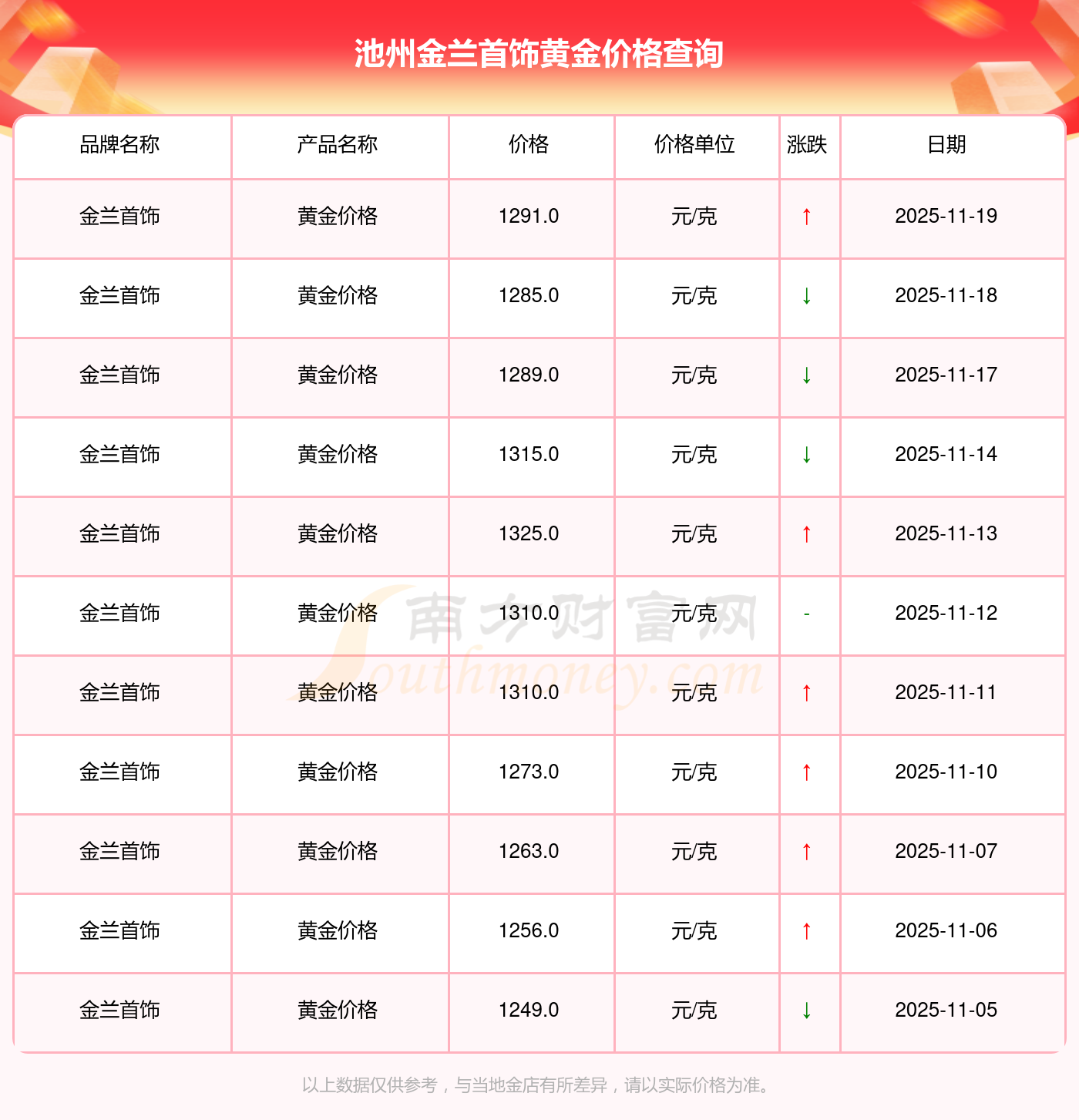 今日池州金兰首饰黄金价格公布当下,今日的黄金一克卖多少钱2025年11月19日池州金兰首饰黄金价格是1291.0元/克。
