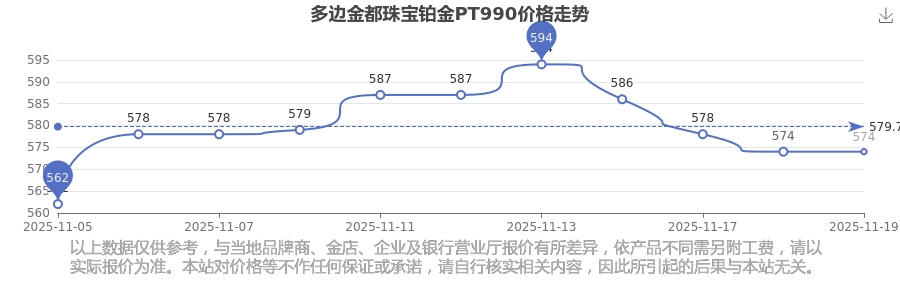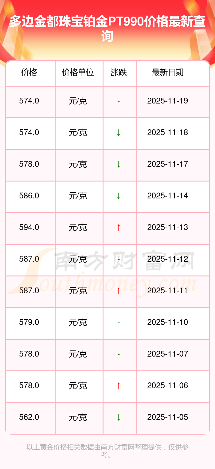 574.0元/克的价格,是多边金都珠宝今日 铂金PT990的最新行情。