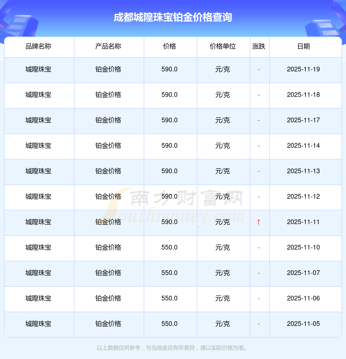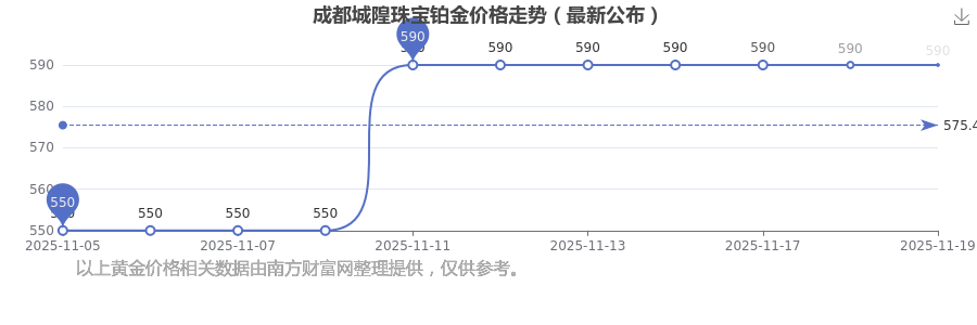 今日(2025年11月19日),成都城隍珠宝铂金价格的定价为 590.0元/克。