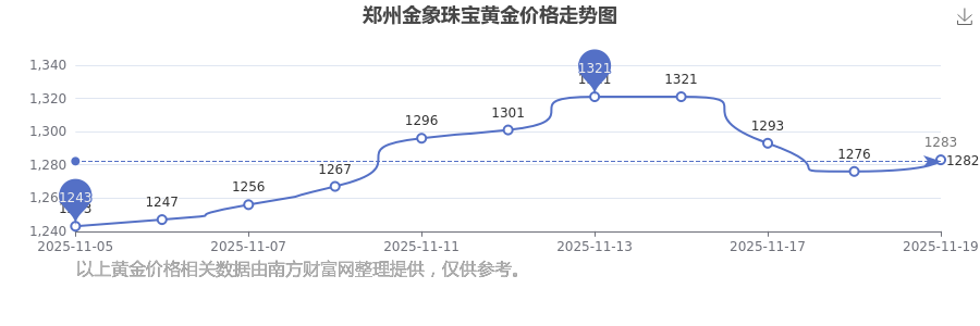 今日郑州金象珠宝黄金价格为1283.0元/克。