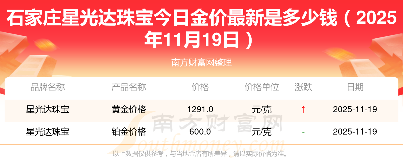 2025年11月19日石家庄星光达珠宝金价查询:黄金价格1295.0元/克,铂金价格619.0元/克,饰品金价(内地)1295.0元/克,黄金饰品(香港)45120.0,铂金价格(香港)17690.0,金条价格(香港)40700.0,金条金价(内地)1133.0元/克,黄金价格1291.0元/克,铂金价格600.0元/克,足金价格1291.0元/克,黄金价格1263.0元/克。
