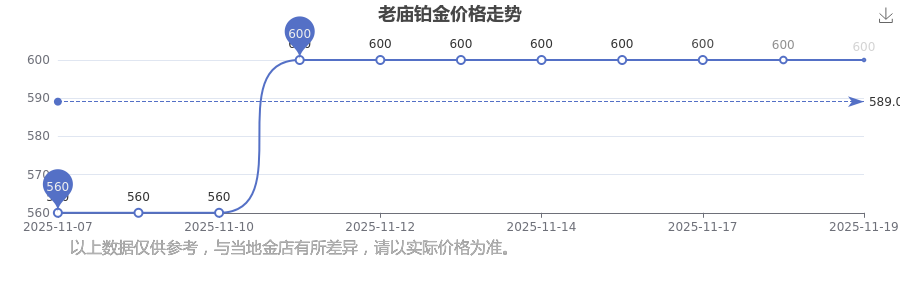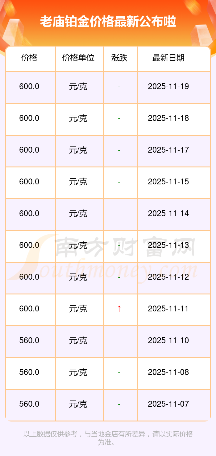 今日老庙 铂金价格的最新定价为600.0元/克。
