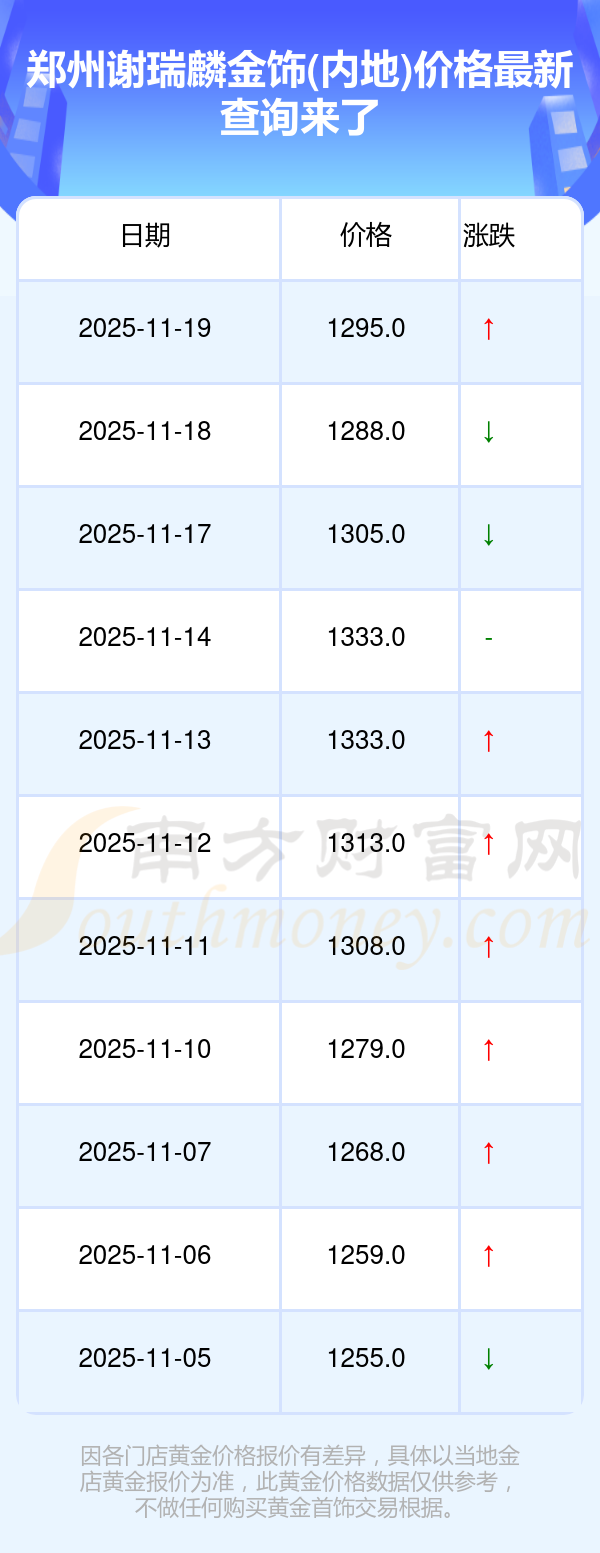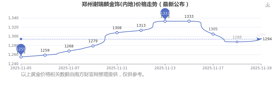 今日郑州谢瑞麟金饰(内地)价格是1295.0元/克。