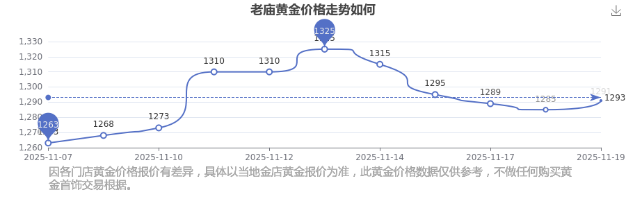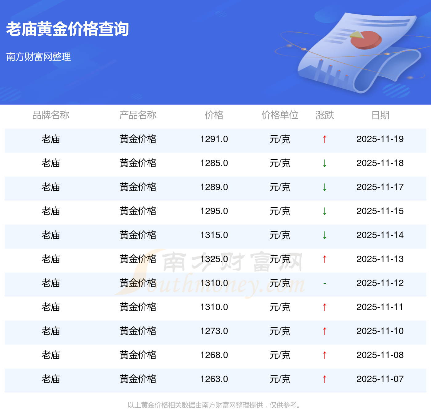 2025年11月19日老庙黄金价格为1291.0元/克。