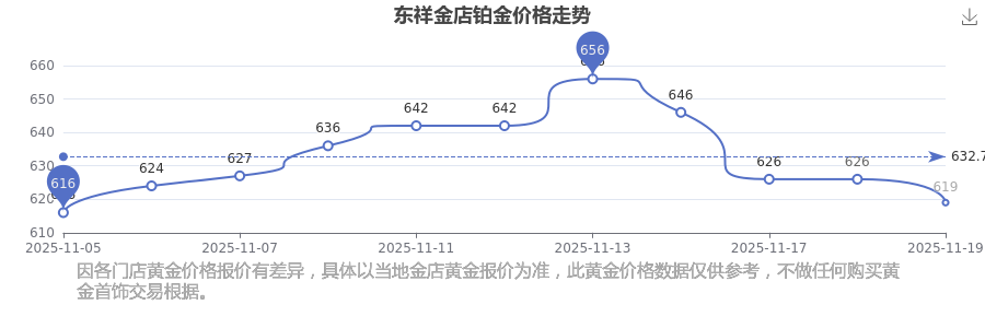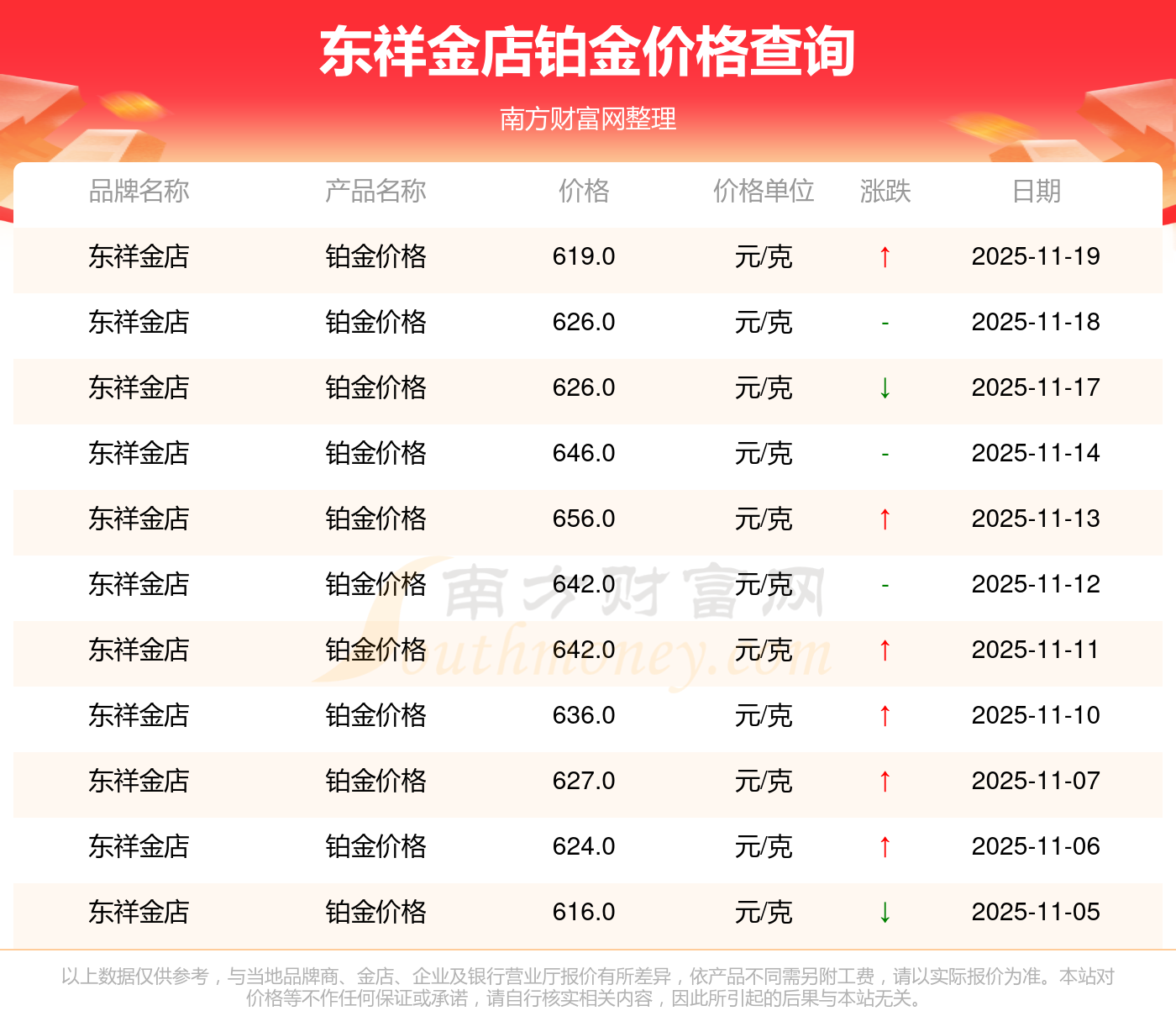 2025年11月19日东祥金店铂金价格是619.0元/克。