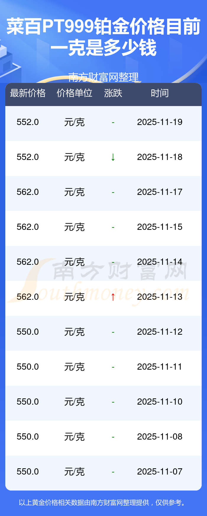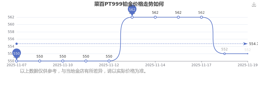最新数据表明,菜百今日 PT999铂金价格为552.0元/克。