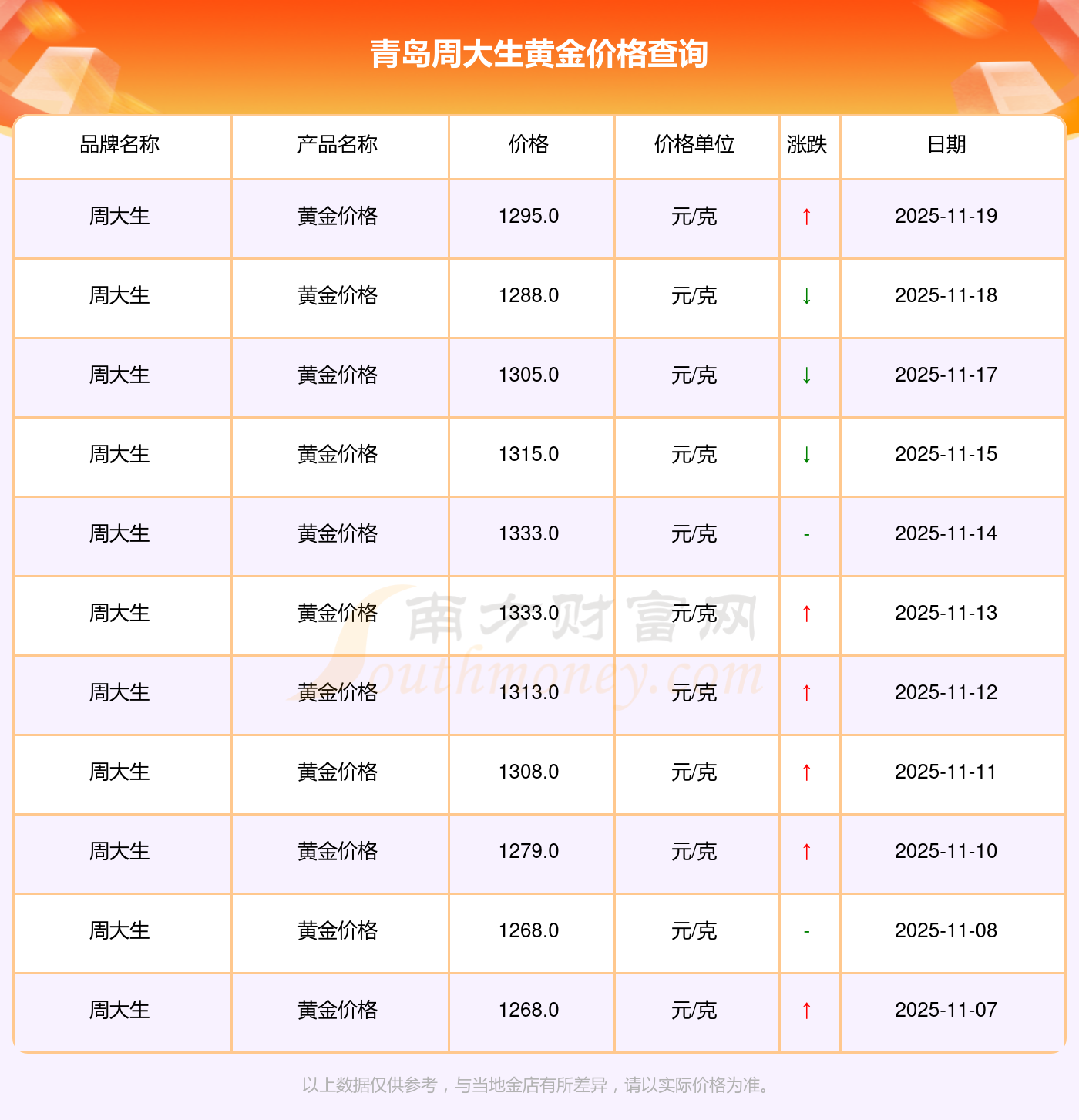 2025年11月19日青岛周大生黄金价格:1295.0元/克。
