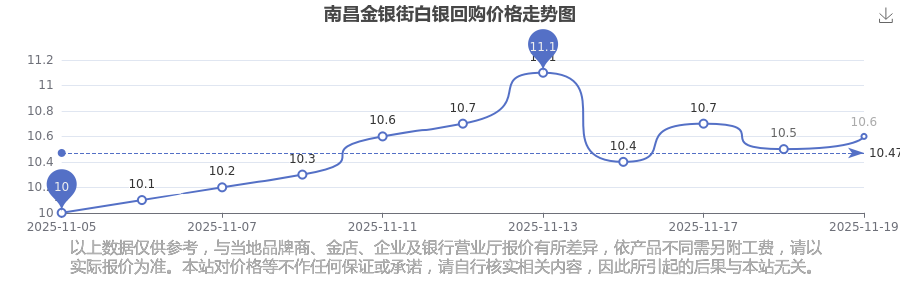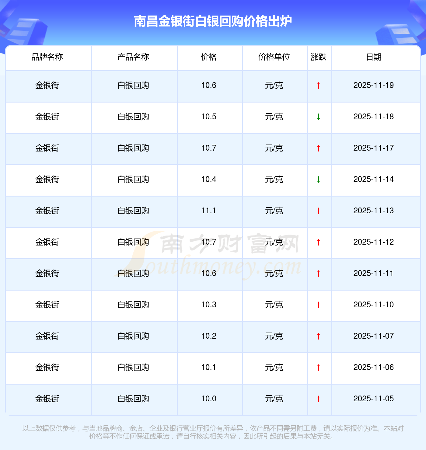 扎根成都的金银街(成都)金银珠宝有限公司,作为专业的珠宝企业,其业务体系包括黄金珠宝设计研发、制作包装,同时涵盖电子商务、物流配送、会务展览,以及文化艺术品和奢侈品展示交易等业务内容。2025年11月19日南昌金银街白银回购现在每克多少钱?最新白银回购价格来了,随小编来了解一下详情。