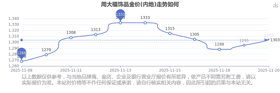 2025年11月21日周大福饰品金价(内地)最新是1305.0元/克。