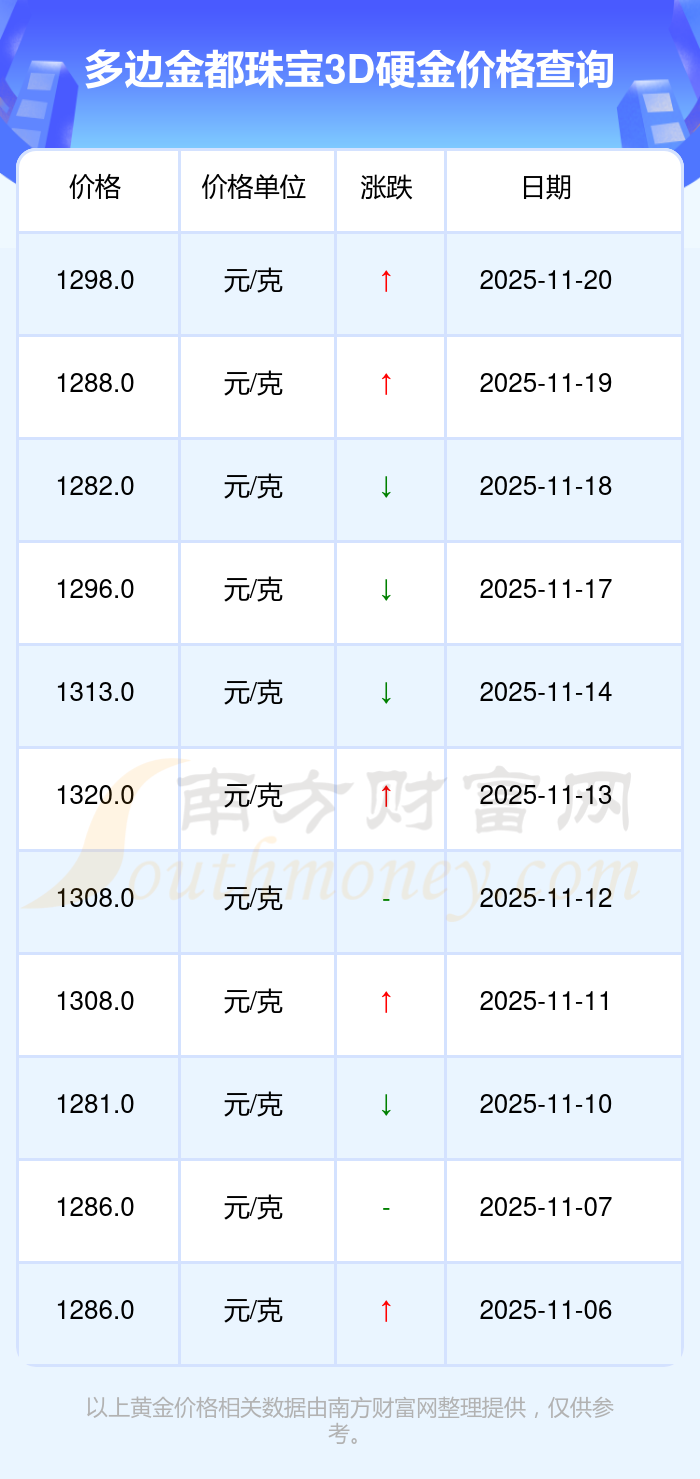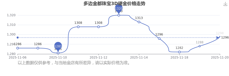 今日多边金都珠宝 3D硬金的最新定价为1298.0元/克。