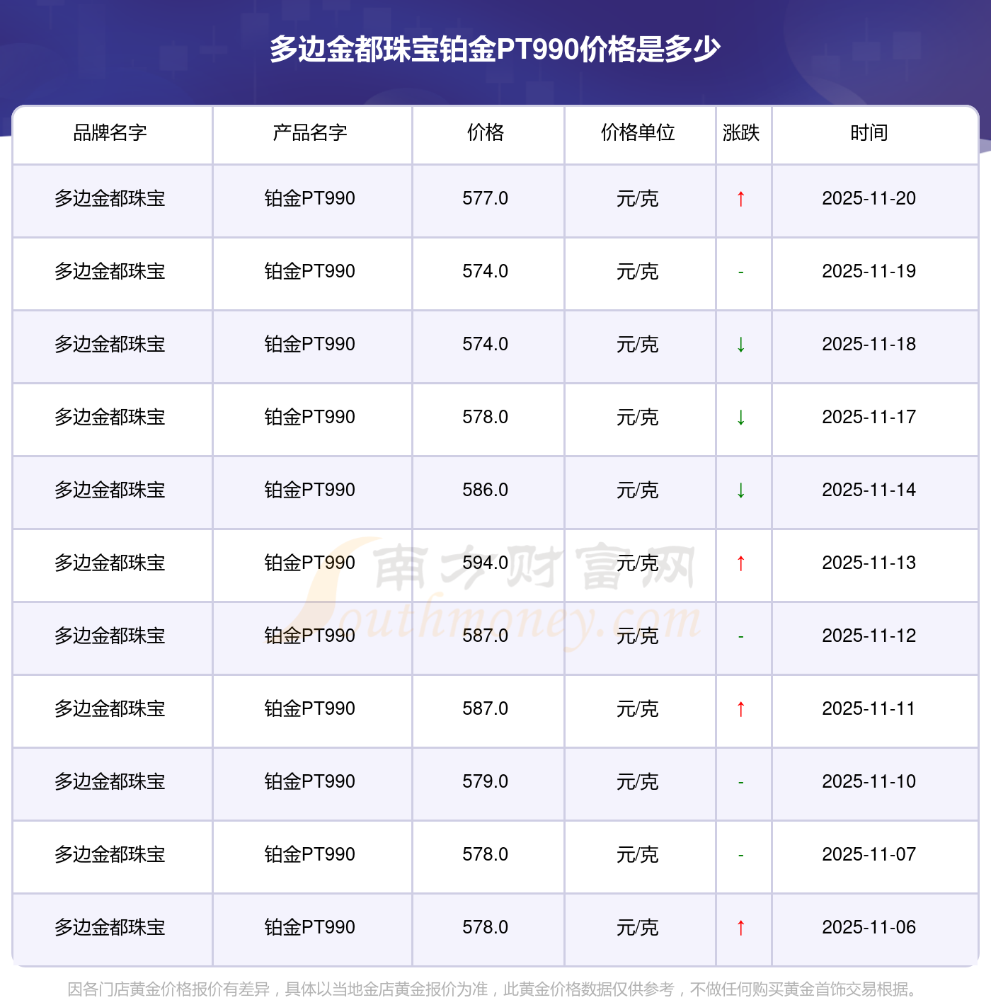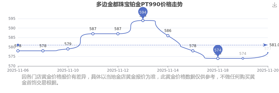 多边金都珠宝今日铂金PT990的最新市场行情价为577.0元/克。