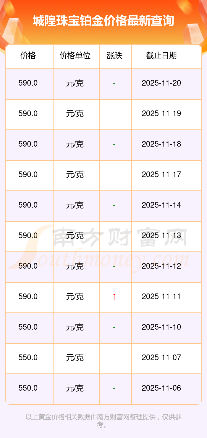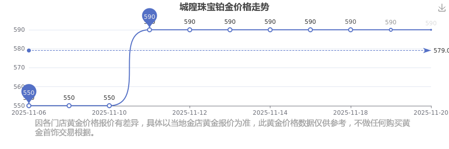 城隍珠宝 铂金价格在今日的最新价格显示为590.0元/克。