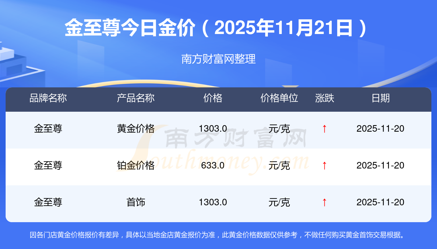 2025年11月21日金至尊金价查询:铂金价格540.0元/克,PT950铂金540.0元/克,PT990铂金545.0元/克,PT999铂金552.0元/克,饰品金条价格1060.0元/克,摆件价格392.0元/克,足金价格1270.0元/克,基础银价11.8元/克,黄金价格1302.0元/克,铂金价格600.0元/克,金条/金块价格1257.0元/克。