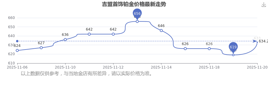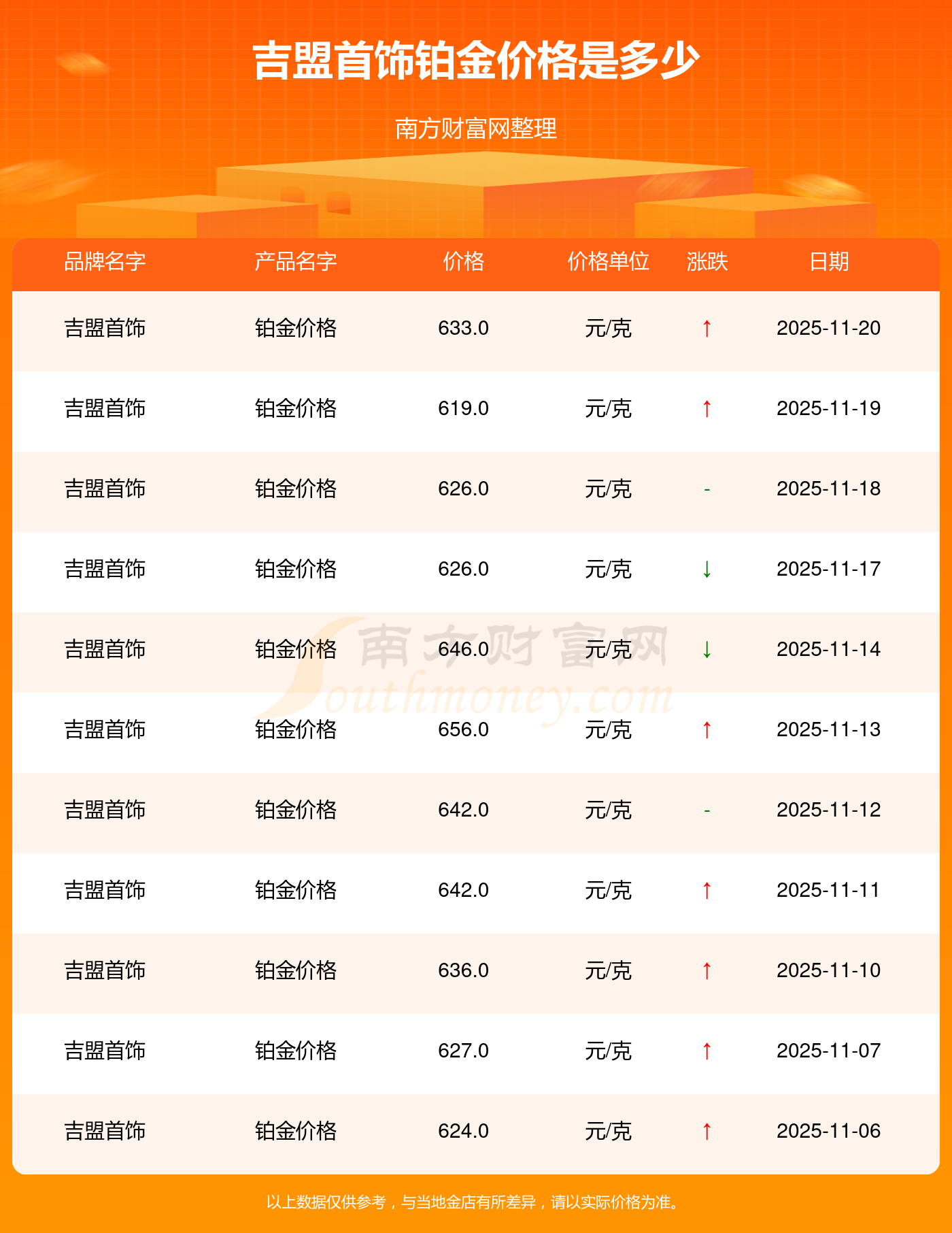 吉盟首饰今日铂金价格的最新标价为633.0元/克。