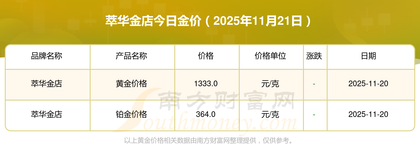 2025年11月21日萃华金店最新价格:铂金价格540.0元/克,PT950铂金540.0元/克,PT990铂金545.0元/克,PT999铂金552.0元/克,饰品金条价格1060.0元/克,摆件价格392.0元/克,足金价格1270.0元/克,基础银价11.8元/克,黄金价格1302.0元/克,铂金价格600.0元/克,金条/金块价格1257.0元/克。