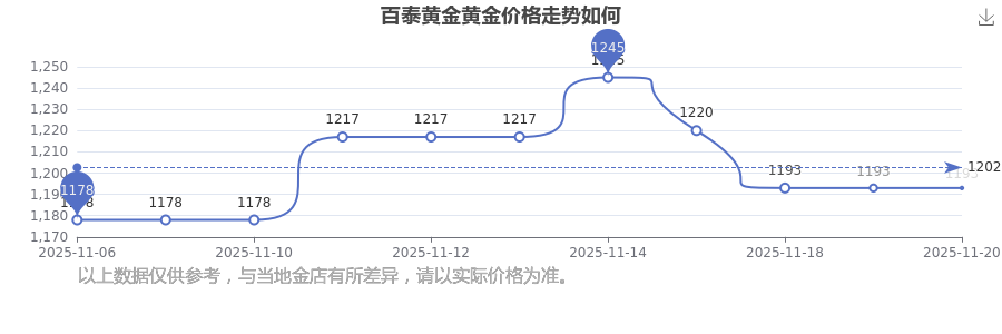 今日黄金价格查询_现在金价黄金一克多少钱,黄金价格是多少钱一克?通常情况下1克黄金的价钱是多少左右?今日百泰黄金黄金价格最新价格为1193.0元/克。