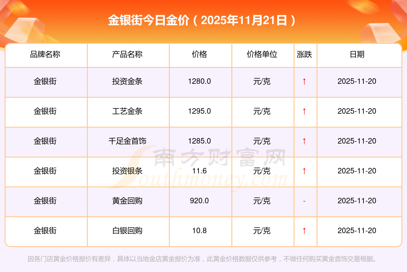 2025年11月21日金银街今日价格:铂金价格540.0元/克,PT950铂金540.0元/克,PT990铂金545.0元/克,PT999铂金552.0元/克,饰品金条价格1060.0元/克,摆件价格392.0元/克,足金价格1270.0元/克,基础银价11.8元/克,黄金价格1302.0元/克,铂金价格600.0元/克,金条/金块价格1257.0元/克。