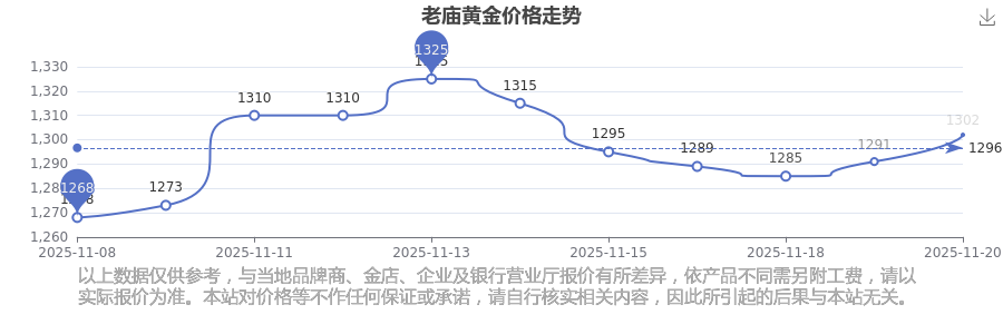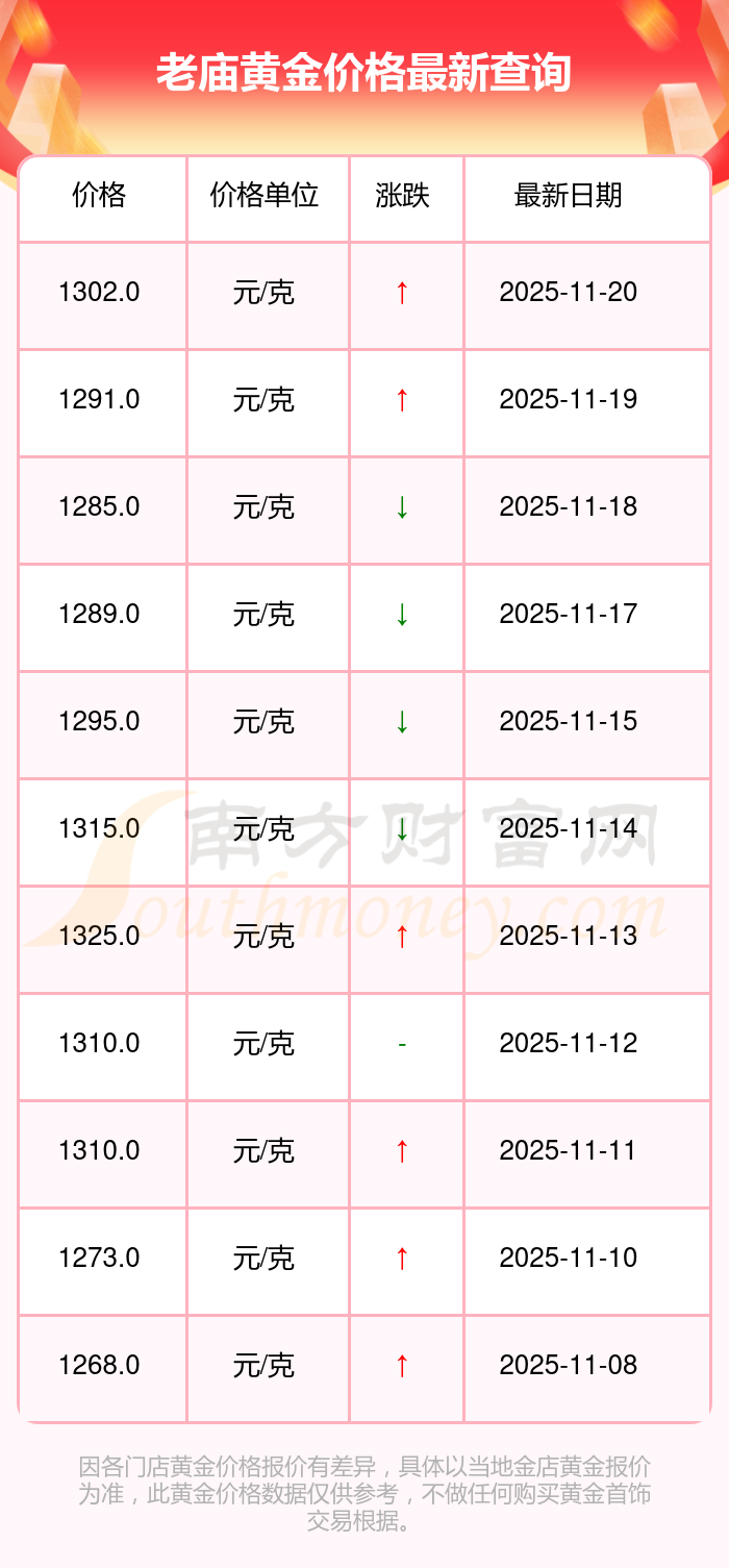 今日(2025年11月21日)老庙黄金价格:1302.0元/克。