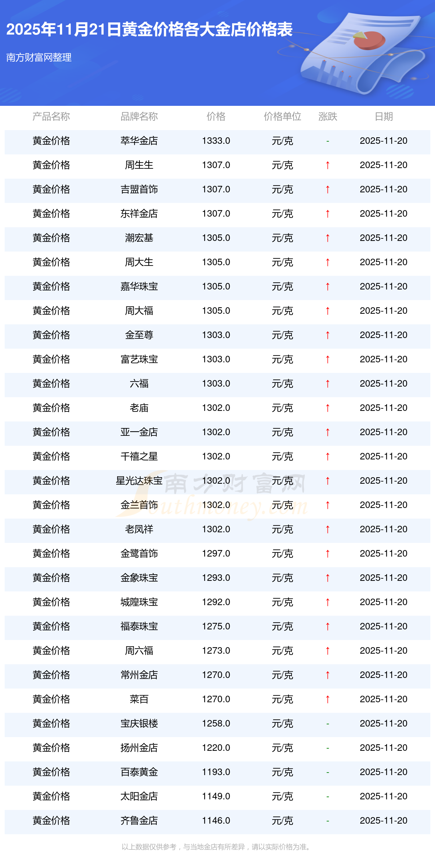 2025年11月21日,菜百、菜百、菜百、菜百、菜百、菜百、菜百、菜百、老庙、老庙、老庙等各大金店品牌黄金价格今日价格如下:菜百540.0元/克、菜百540.0元/克、菜百545.0元/克、菜百552.0元/克、菜百1060.0元/克、菜百392.0元/克、菜百1270.0元/克、菜百11.8元/克、老庙1302.0元/克、老庙600.0元/克、老庙1257.0元/克。