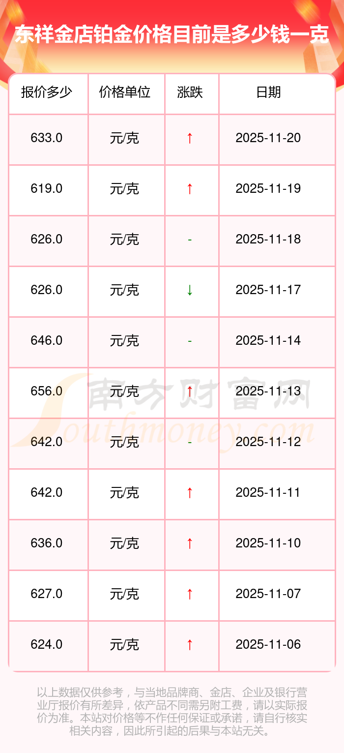 今日(2025年11月21日),东祥金店铂金价格最新价格为633.0元/克。
