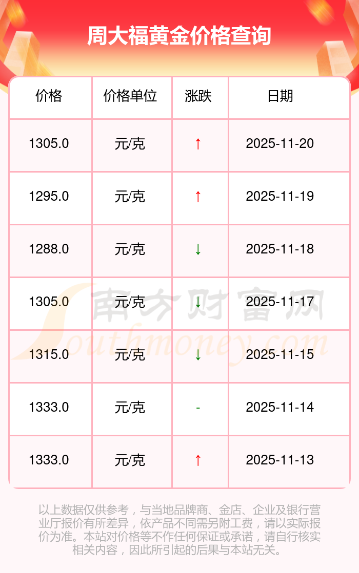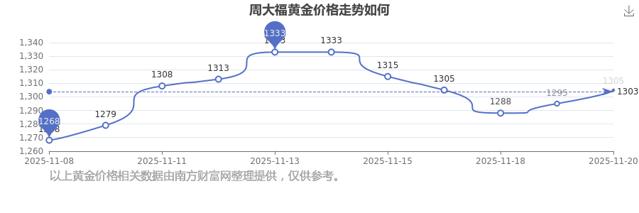 2025年11月21日周大福黄金价格:1305.0元/克。