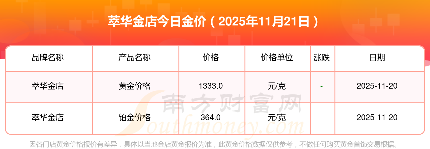 现在萃华金店黄金价格是多少钱1克_2025年萃华金店今日金价是多少钱一克,最新萃华金店查询,2025年11月21日萃华金店黄金价格现在每克多少钱?最新萃华金店黄金价格报价公布,一起来看看吧!