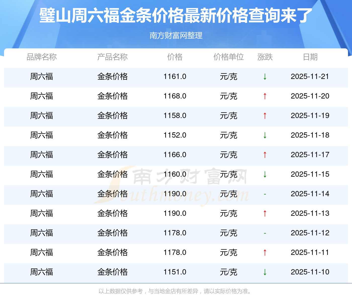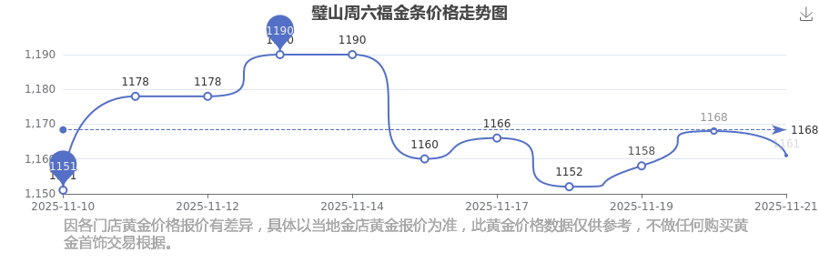 2025年11月21日,璧山周六福金条价格每克的价值量定格在1161.0元/克。
