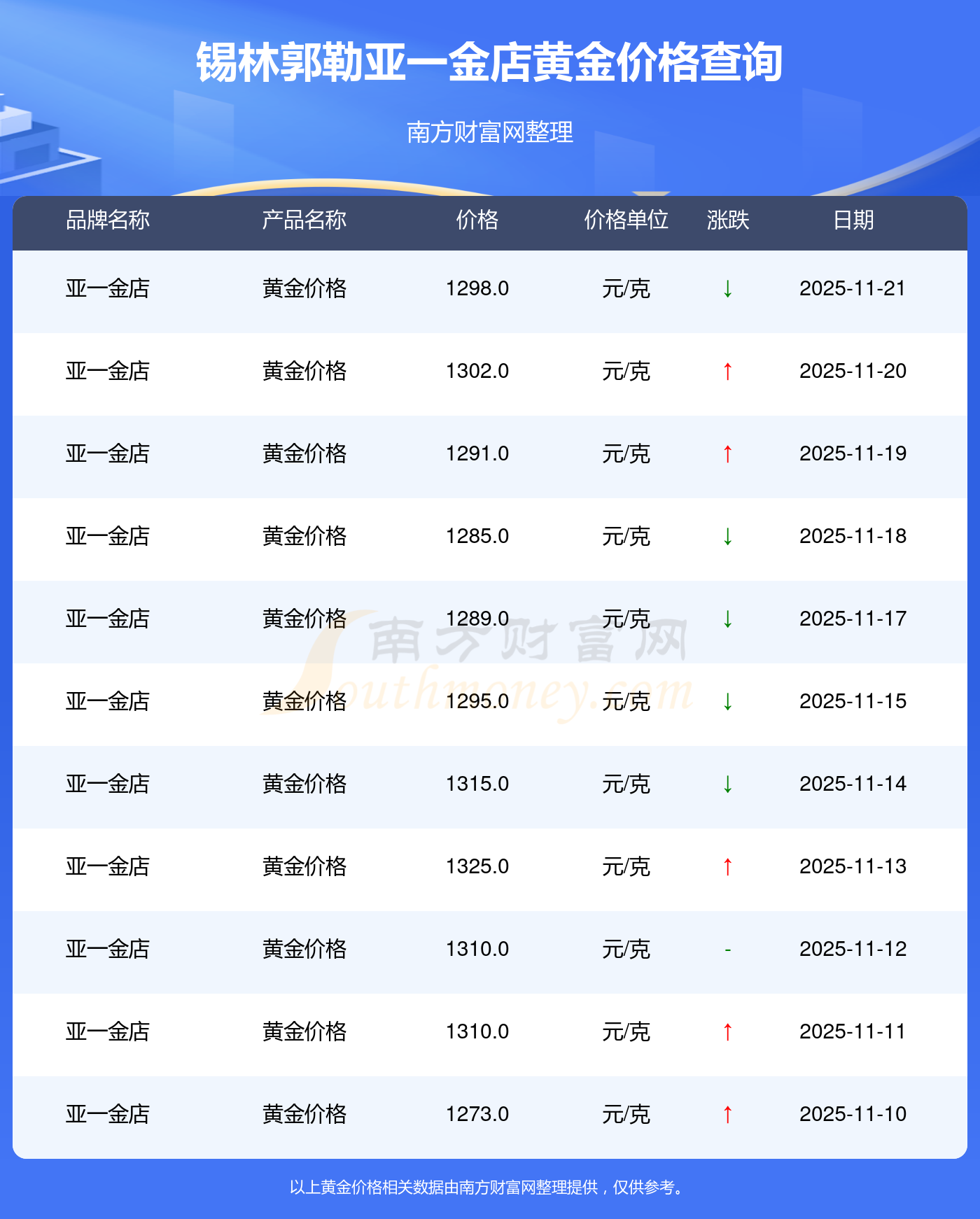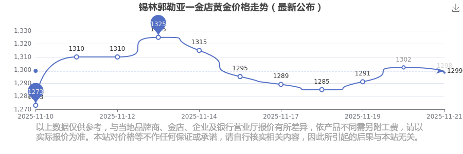 2025年11月21日当天,锡林郭勒亚一金店黄金价格的单价是 1298.0元/克。