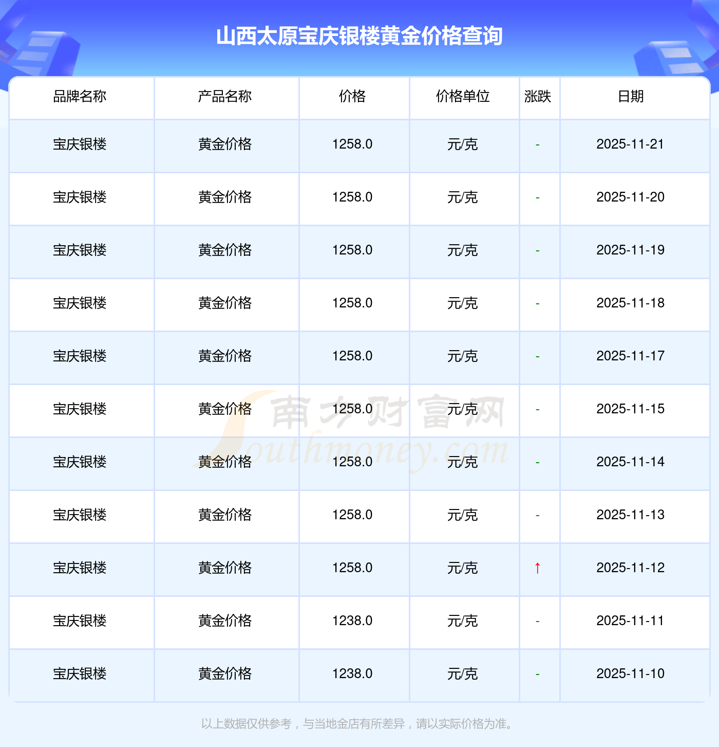 山西太原宝庆银楼黄金价格在 2025年11月21日,其市场价格为 1258.0元/克。