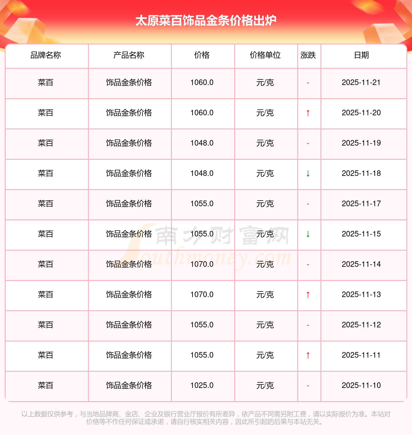 以上数据仅供参考,与当地品牌商、金店、企业及银行营业厅报价有所差异,依产品不同需另附工费,请以实际报价为准。本站对价格等不作任何保证或承诺,请自行核实相关内容,因此所引起的后果与本站无关。