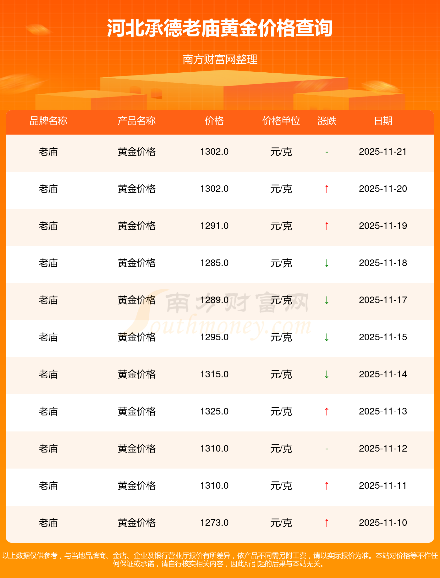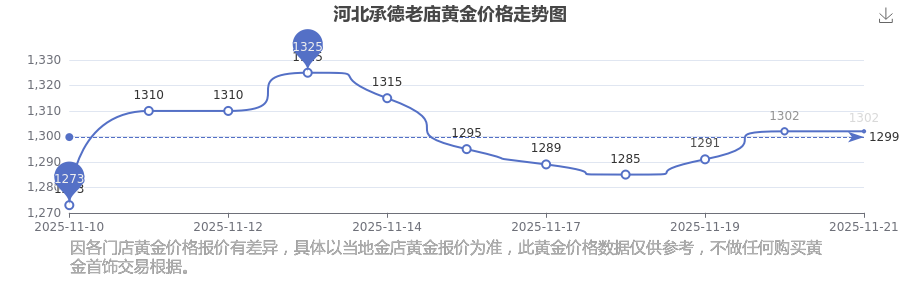 河北承德老庙的黄金价格在今日(2025年11月21日),每克售价为1302.0元/克。