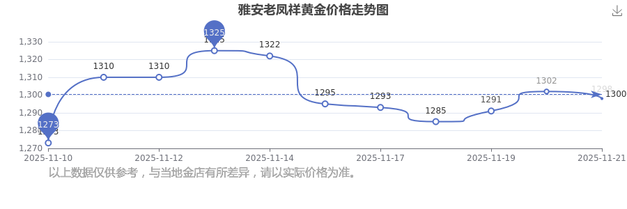 雅安老凤祥在 2025年11月21日的黄金价格零售价格为 1298.0元/克。